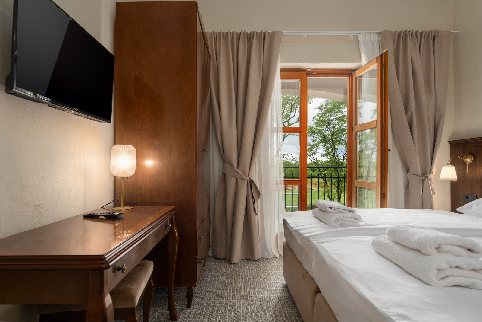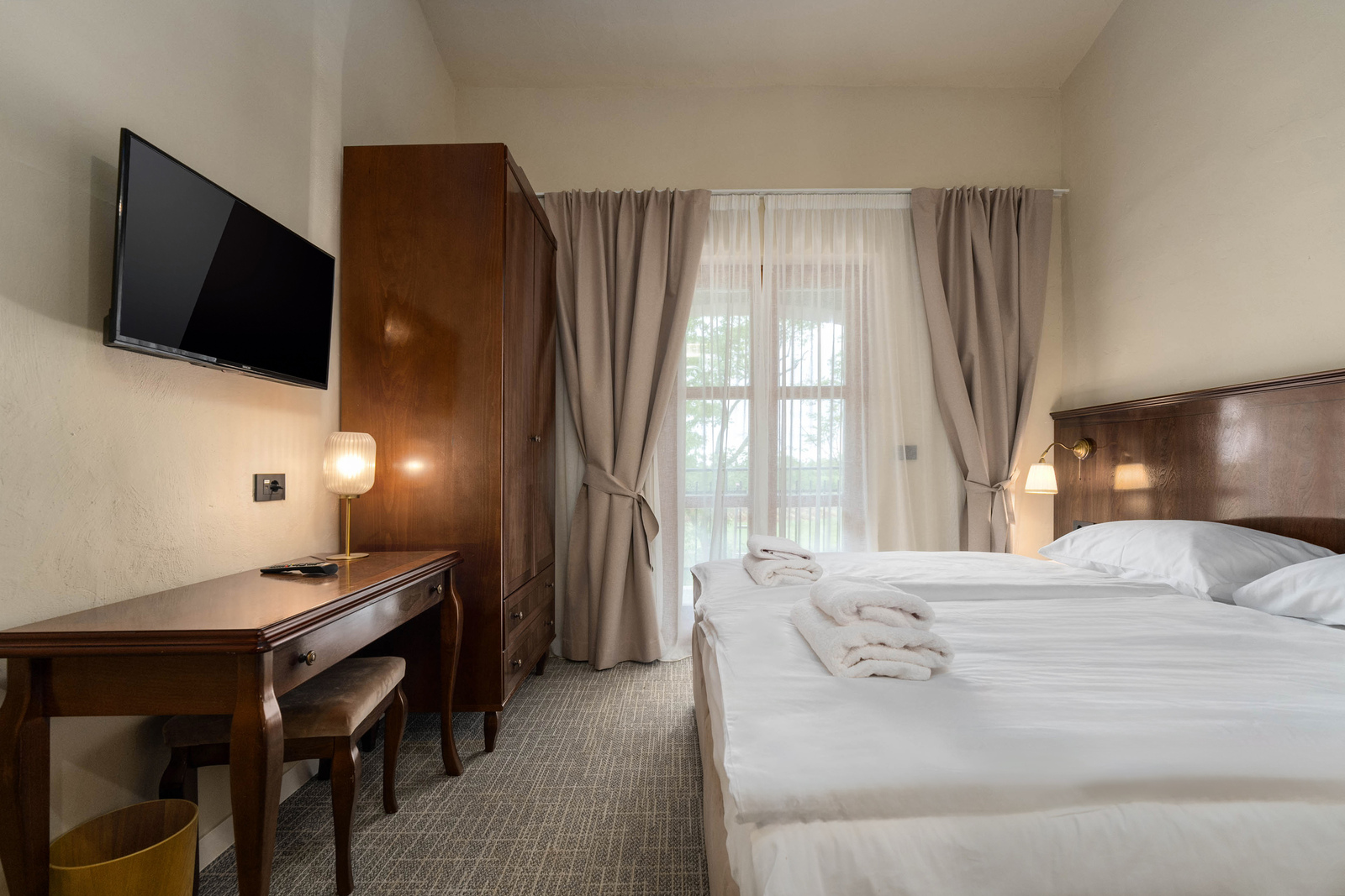 Unser Standard Doppelzimmer in der Nähe von Poreč bietet den perfekten Rückzugsort für Paare oder Freunde, die Komfort und Funktionalität suchen. Das Zimmer ist mit zwei bequemen Betten ausgestattet, die von weicher Bettwäsche umgeben sind und einen guten Schlaf versprechen. Darüber hinaus verfügt das Zimmer über einen Flachbildfernseher, kostenloses WLAN und eine direkte Telefonleitung für alle Ihre Bedürfnisse. Die klimatisierte Umgebung und die moderne Einrichtung mit pastellfarbenen Wänden und weichen Teppichen schaffen eine gemütliche Atmosphäre.