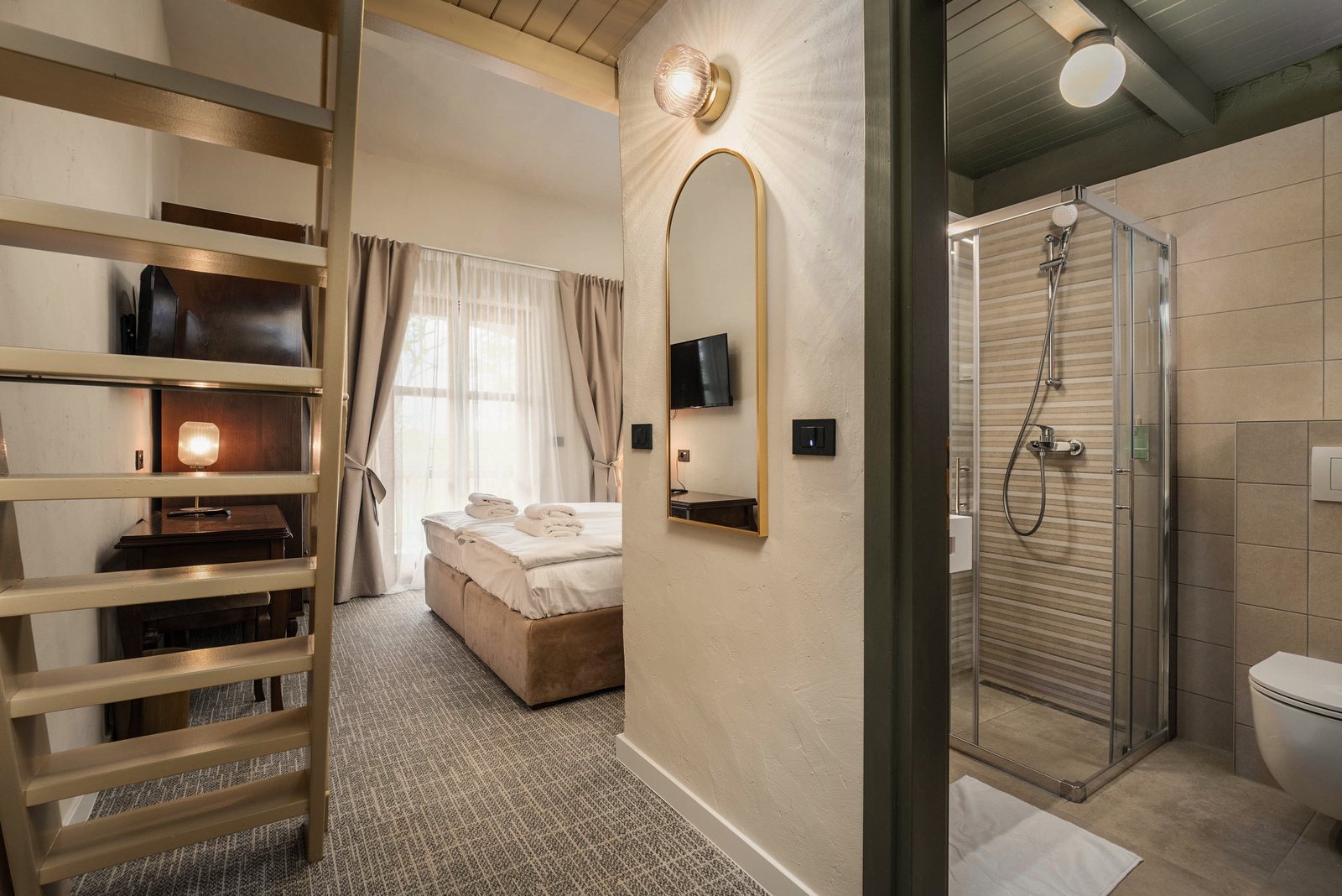 Modernly decorated with pastel walls and soft carpets, the room is spacious and bright thanks to floor-to-ceiling windows. The bathroom, equipped with the latest sanitary ware, offers a spacious shower cabin for relaxation. Spend your morning enjoying the spacious balcony with views of the surroundings or refresh yourself in the upcoming outdoor pool.